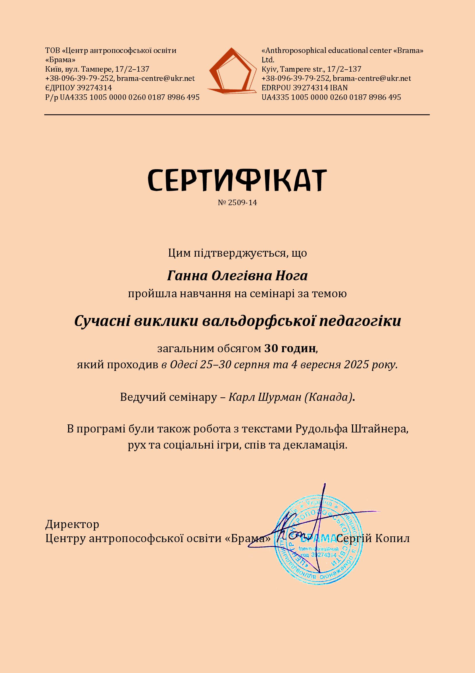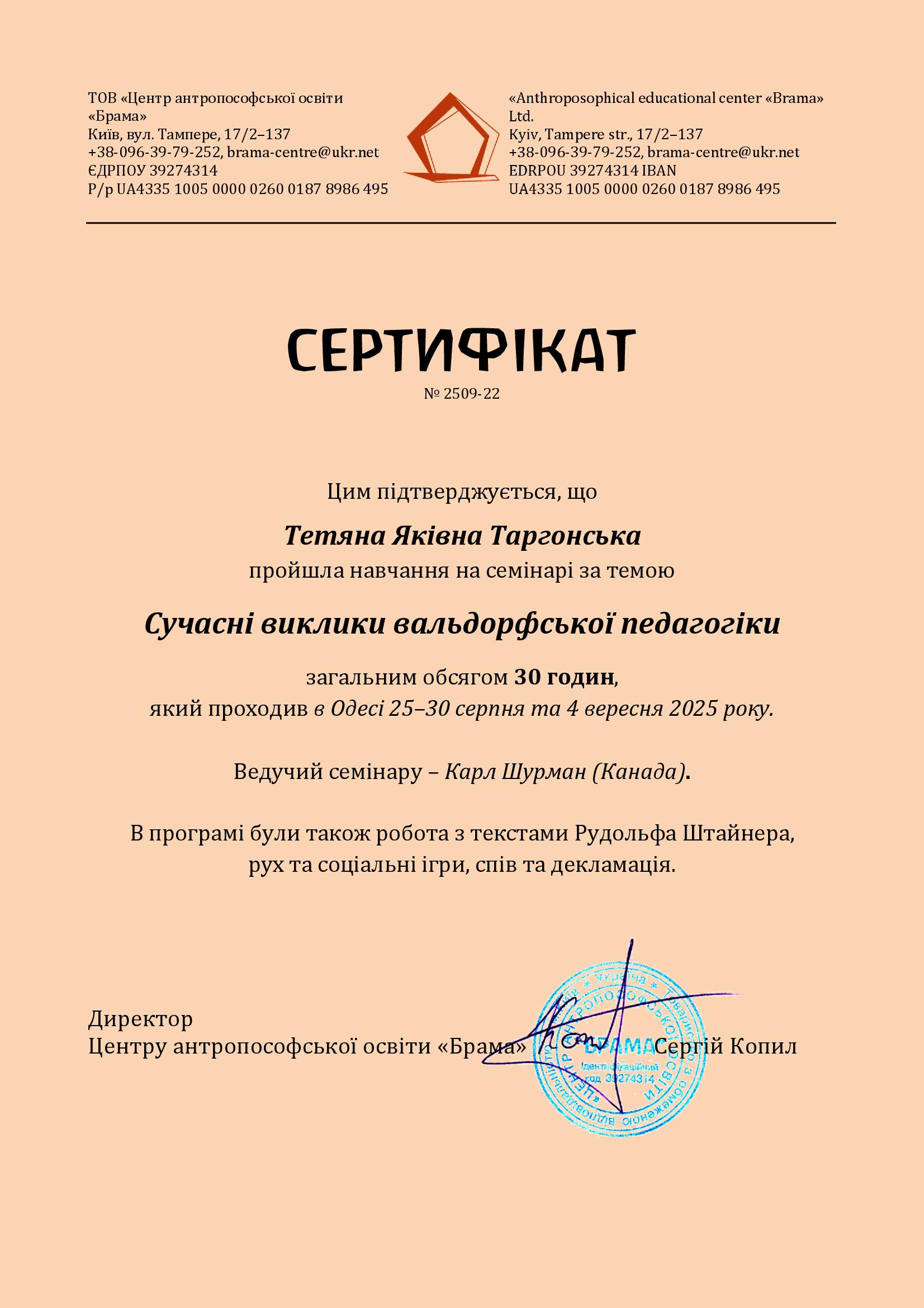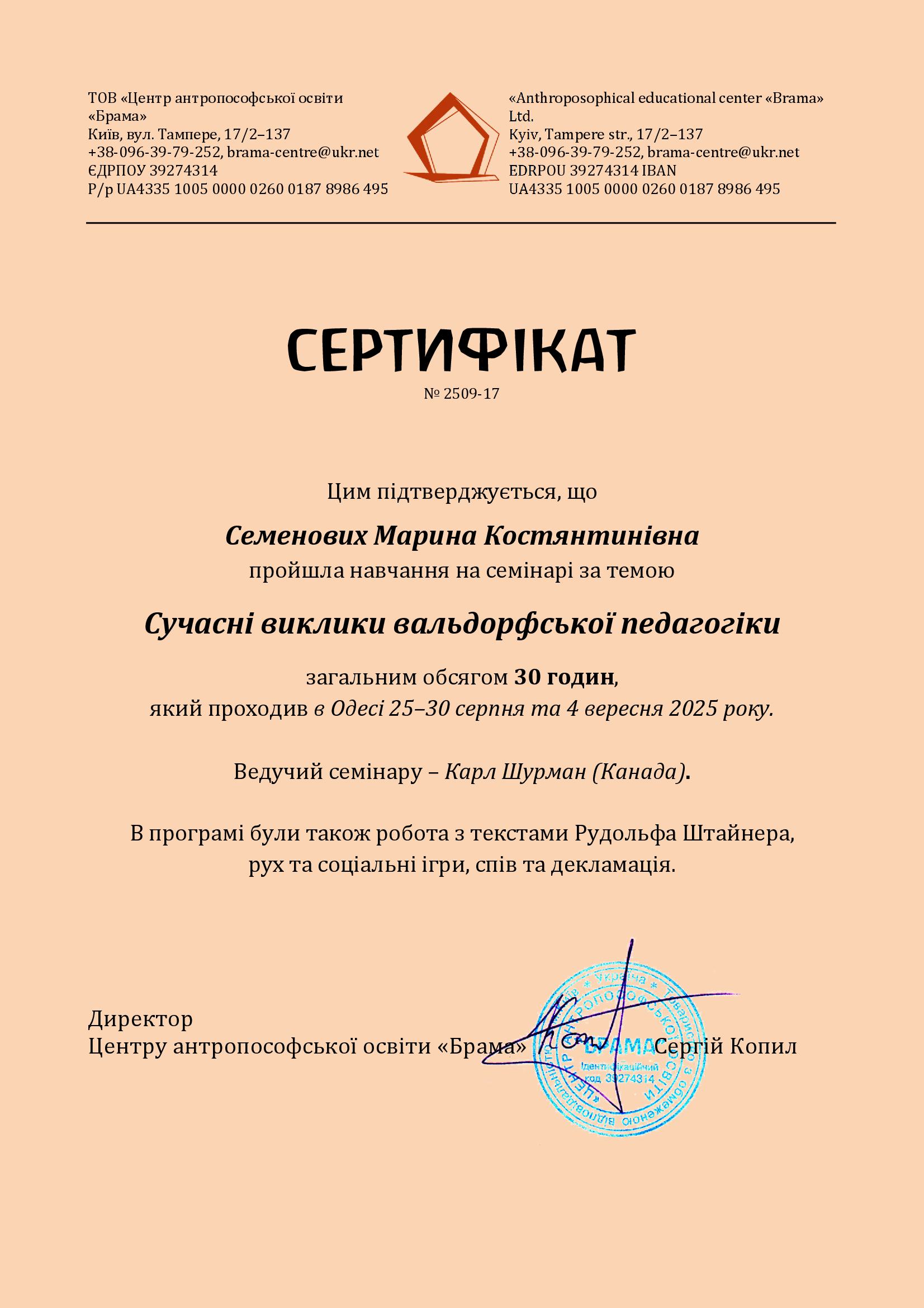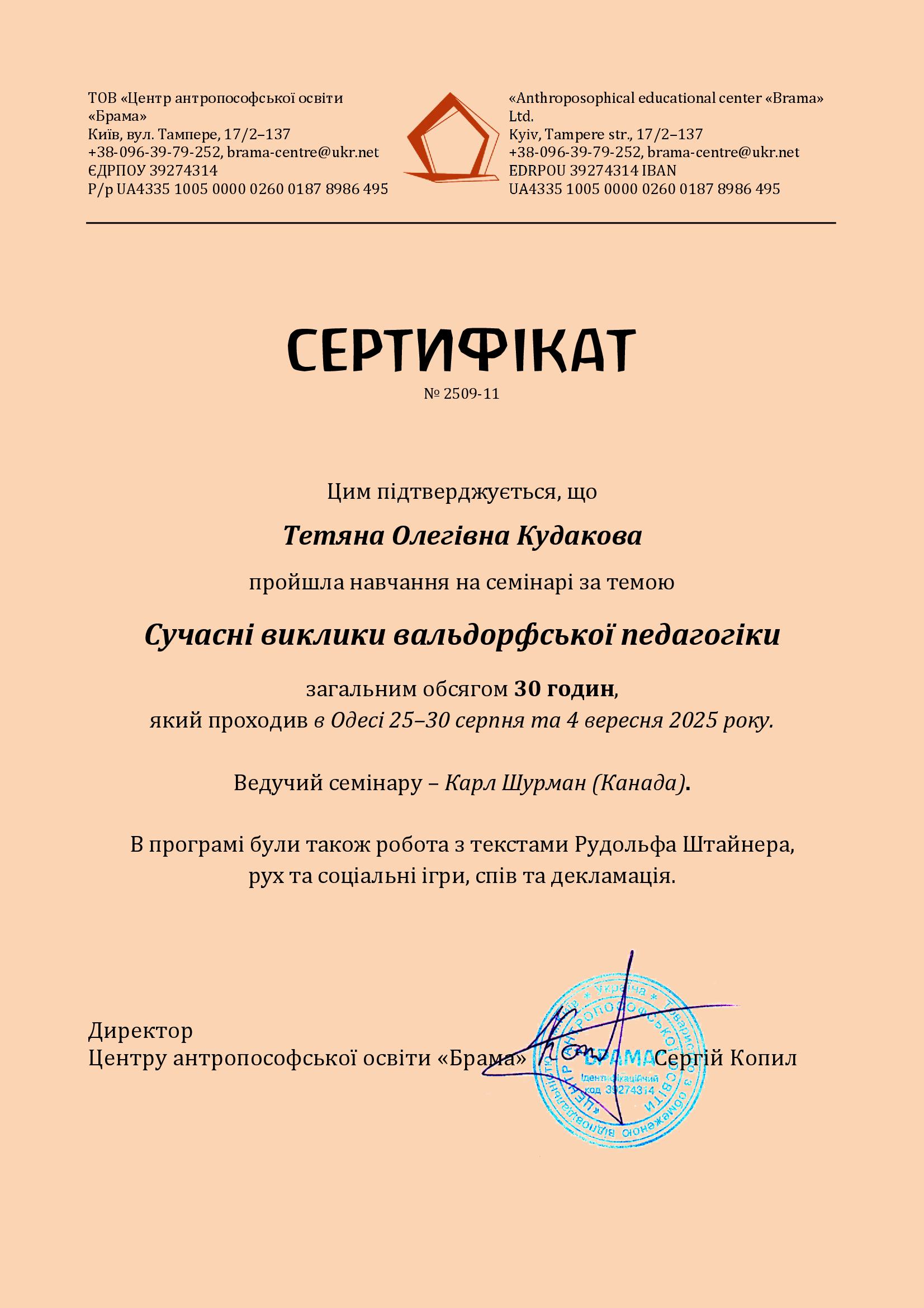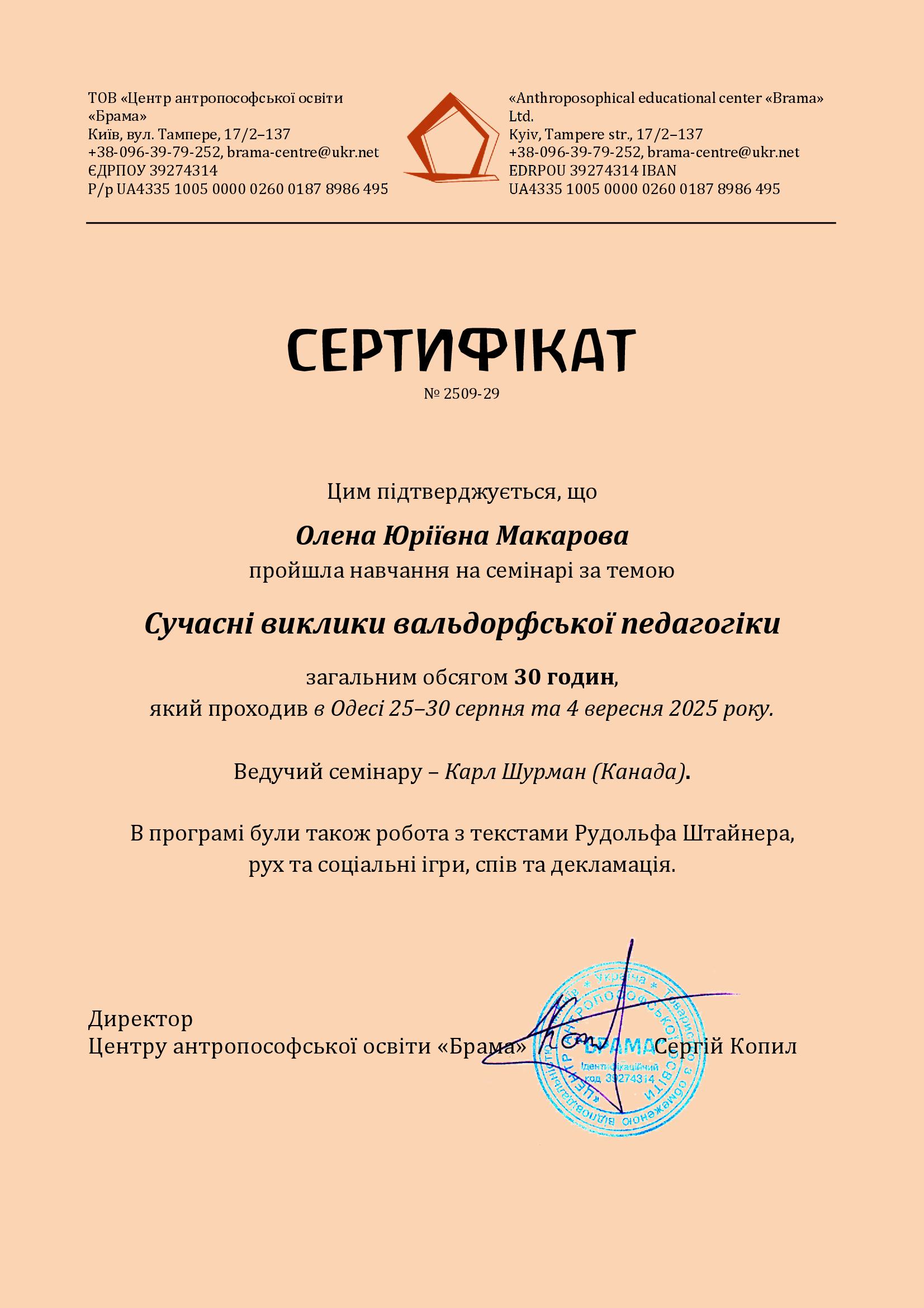 В семінарі прийняли участь та отримали електронні сертифікати ЦАО “Брама” вчителя: