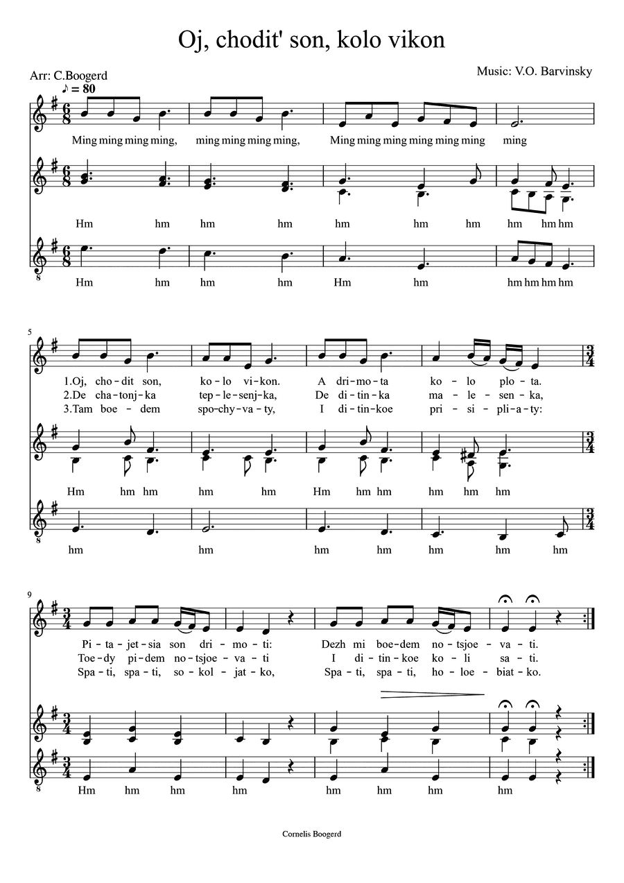 Цікаво, що етерні сили рухаються в часі. Тому етерне тіло можна також назвати «тілом часу». Це ще один спосіб поглянути на те, як пізнати щось про наше етерне тіло. Які наші стосунки з часом? Як ми рухаємося в часових процесах? Ми кілька років працювали над питанням, як етеризувати перебіг дня. Ми також провели кілька семінарів на цю тему в Нідерландах та Словаччині. Це занадто далеко від теми, але для початку ми можемо, наприклад, оглянути наприкінці дня певний період, задавши собі питання: яким було дихання в часових процесах? Дихання є дуже важливим життєвим процесом. Рудольф Штайнер навіть сказав: «Виховувати – це вчити дихати». Маленька дитина ще має цьому навчитися. Зокрема, діти віком до 3-4 років ще сильно прив’язані до своїх тілесних процесів. Добре враховувати це і залишати простір для дихання у всьому. Ми можемо враховувати це, наприклад, у піснях. Якщо подивитися на такі відомі пісні, як «Цей старий дідусь» («This old man») або «У старого Макдональда була ферма» («Old Macdonald had a farm»), то такі пісні є дуже ритмічними. Але чи вистачає в них дихання для найменших дітей? Не зовсім. Такі пісні залишають мало місця для дихання. Структура пісні змушує їх до фіксованої форми. Це поступово стає можливим для старших дітей дошкільного віку, які вже можуть краще адаптуватися. Найменшим краще пропонувати пісні, що дозволяють вільно дихати між рядками. У слов’янських країнах можна знайти багато прекрасних мелодій. Завдяки моїй роботі там я мав змогу познайомитися з багатьма з них. Наприклад, українська пісня «Ой ходить сон коло вікон…» або пісня, яку одна з моїх онучок співає в дитячому садку в Чехії – «Зелена се снітка…». Про це можна ще багато чого розповісти. (Тут ці дві пісні дані в аранжуванні для трьох голосів. З маленькими дітьми можна співати лише першим голосом.)